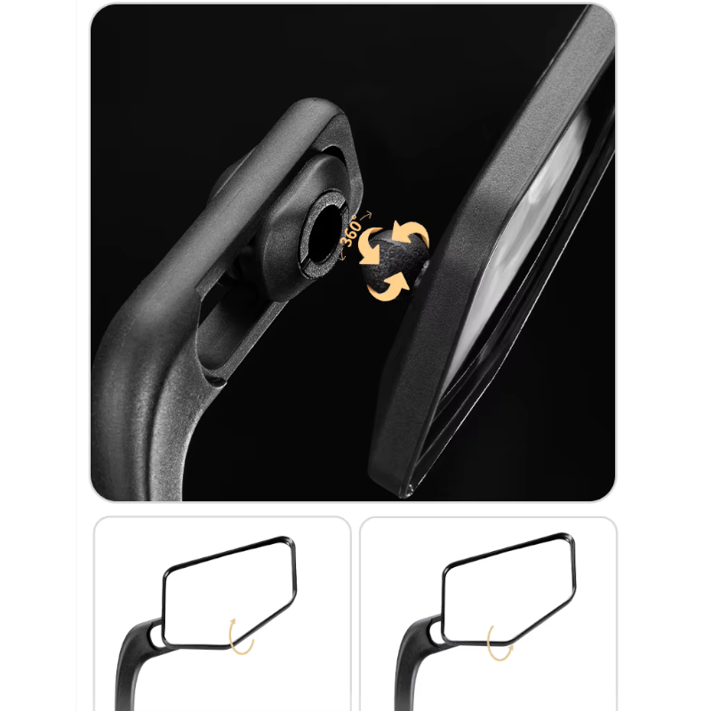 - Regulacja kąta bez narzędzi – uniwersalny przegub kulowy umożliwia łatwe dostosowanie kąta lusterka, zapewniając optymalną widoczność