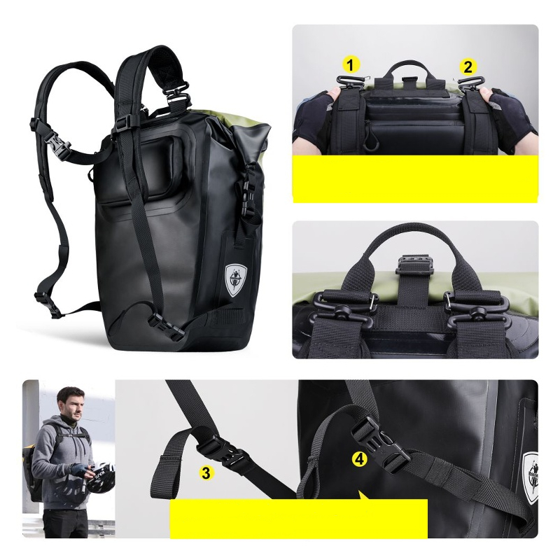 Wykonana z wytrzymałego materiału poliestrowego, który jest wodoodporny i zapewnia ochronę Twoich rzeczy przed wilgocią. Dzięki dużej pojemności pomieścisz w niej wszystko czego potrzebujesz, w tym ubrania, jedzenie, butelkę z wodą i inne akcesoria. W przypadku gdy potrzebujesz nosić sakwę na plecach wystarczy ją odpiąć z bagażnika rowerowego i skorzystać z uchwytów na ramię ukrytych w tylnej kieszeni.
