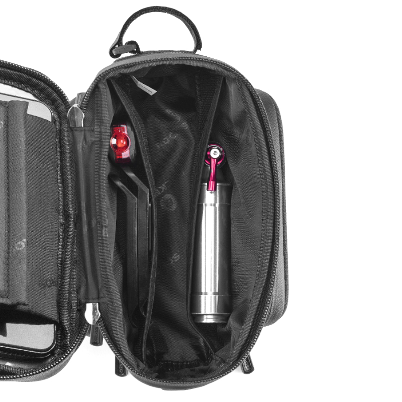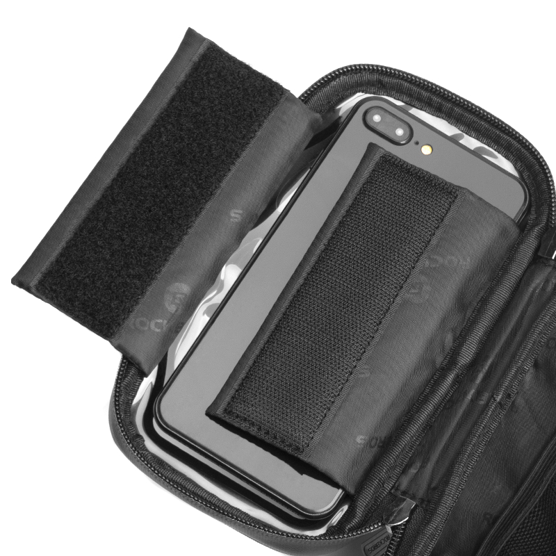 Torba posiada wbudowany uchwyt na telefon z czułą folią TPU, dzięki czemu można obsługiwać ekran dotykowy bez wyjmowania urządzenia. Pod miejscem na telefon znajduje się główna komora, a po bokach rozkładane kieszenie: