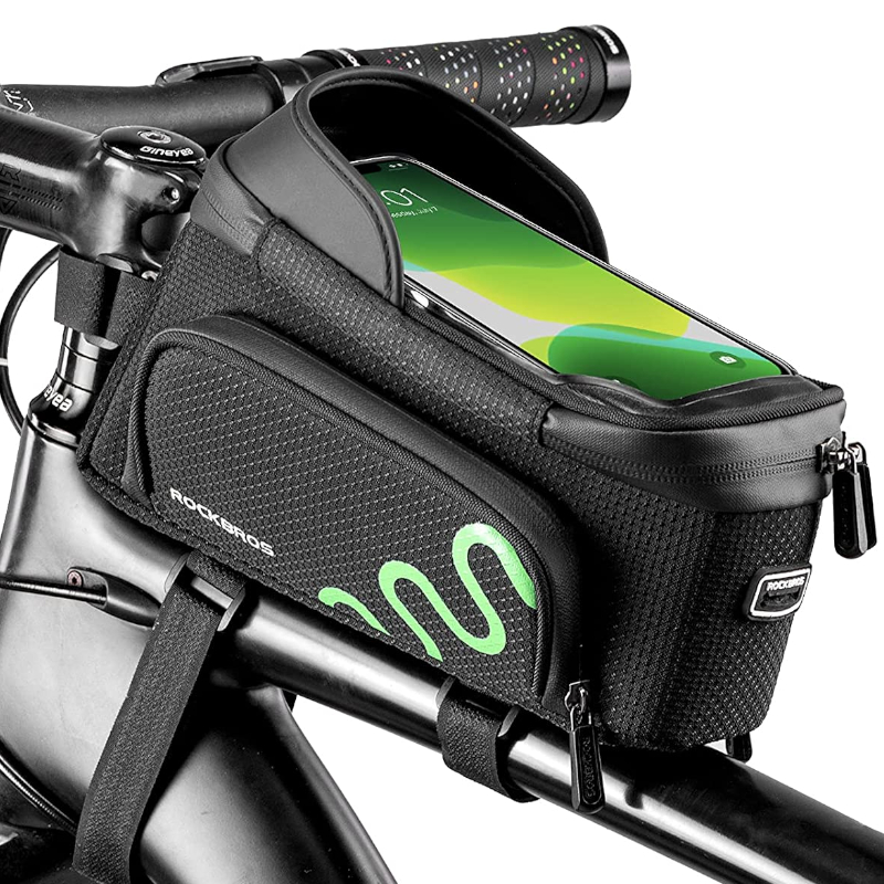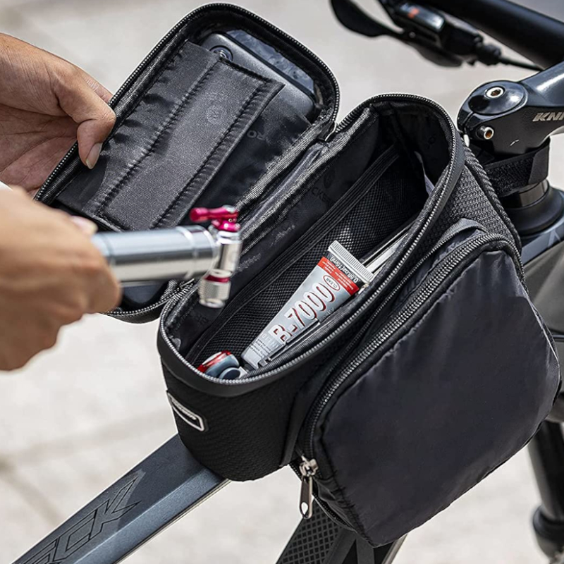 - Połączenie torby na ramę i uchwytu na telefon – dwa w jednym!