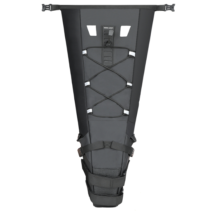 - Elastyczność i zwiększona ładowność – Dzięki solidnej klamrze z tworzywa sztucznego, możliwe jest nie tylko bezpieczne zamknięcie sakwy, ale również dopasowanie jej objętości do ilości przewożonego bagażu. W połączeniu z gumosznurkami na górze torby, użytkownik zyskuje dodatkowe miejsce na lekkie przedmioty, jak kurtka, bidon czy mały statyw.
