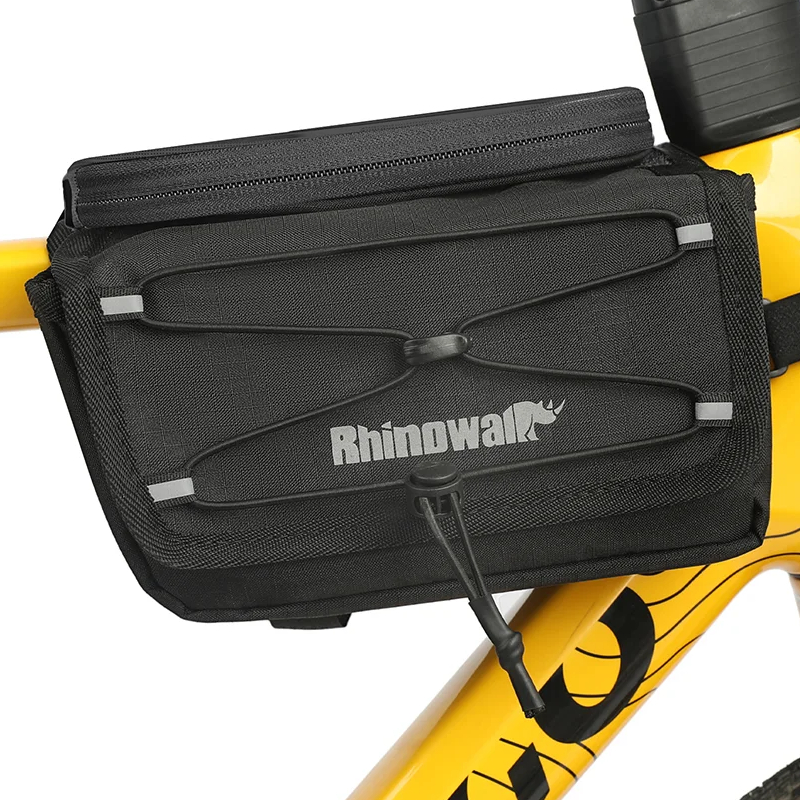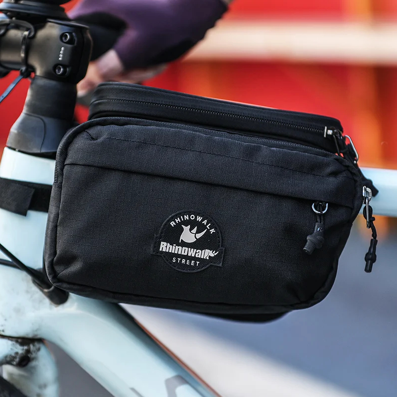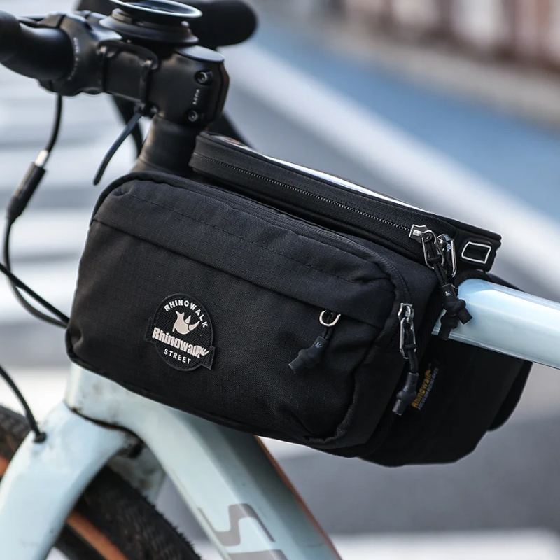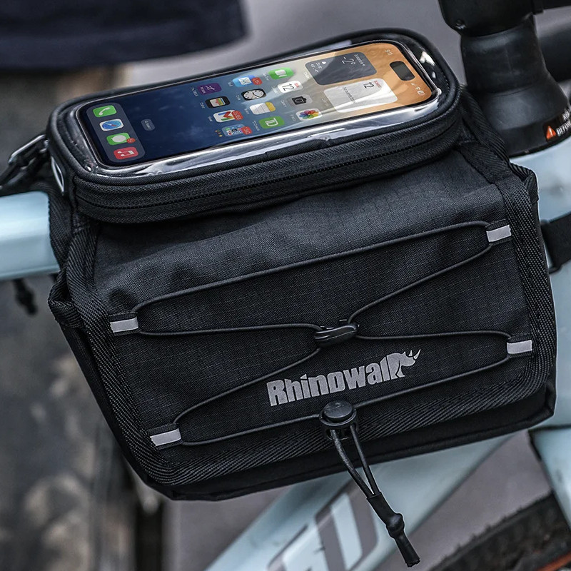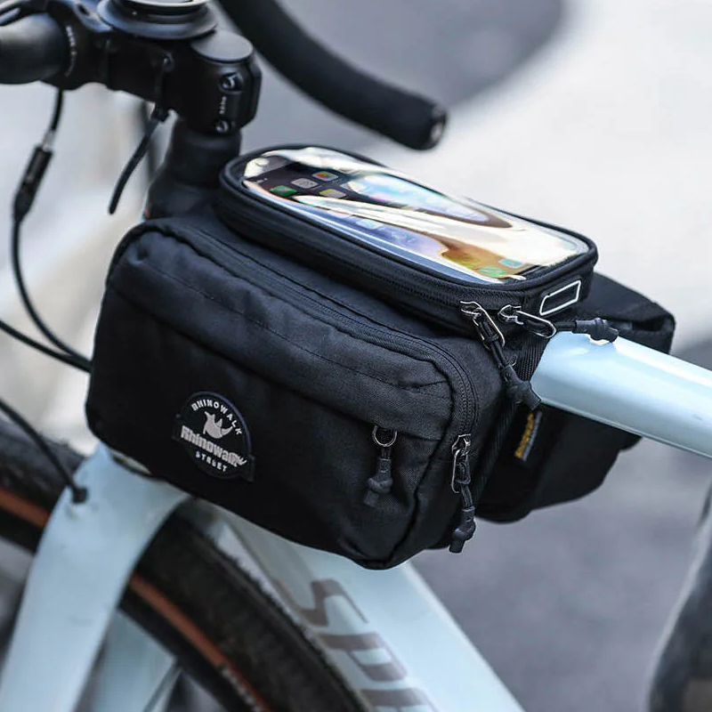 Torba rowerowa na ramę podwójna BCT0205BK marki RHINOWALK to torba z odpinanym etui na telefon montowana na ramie roweru, która sprawia że smartfon jest zawsze pod ręką, bezpieczny i w pełni obsługiwalny bez zatrzymywania się. Przezroczysta nakładka z materiału TPU umożliwia swobodne korzystanie z ekranu dotykowego przez cały czas jazdy — bez wyjmowania telefonu z etui.