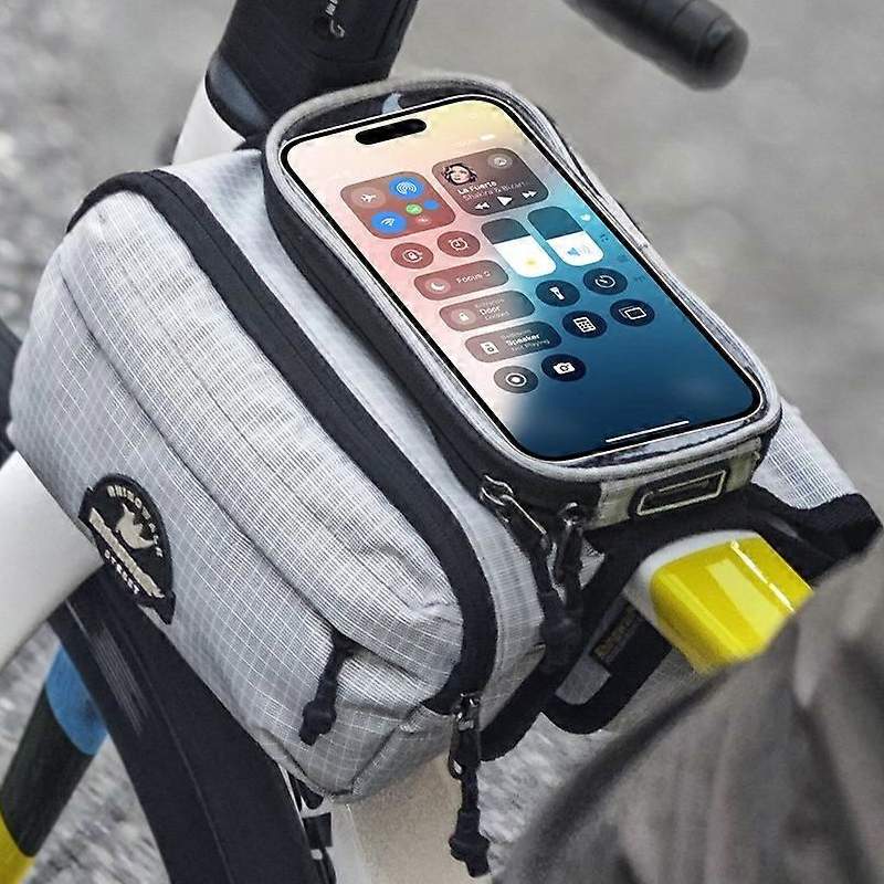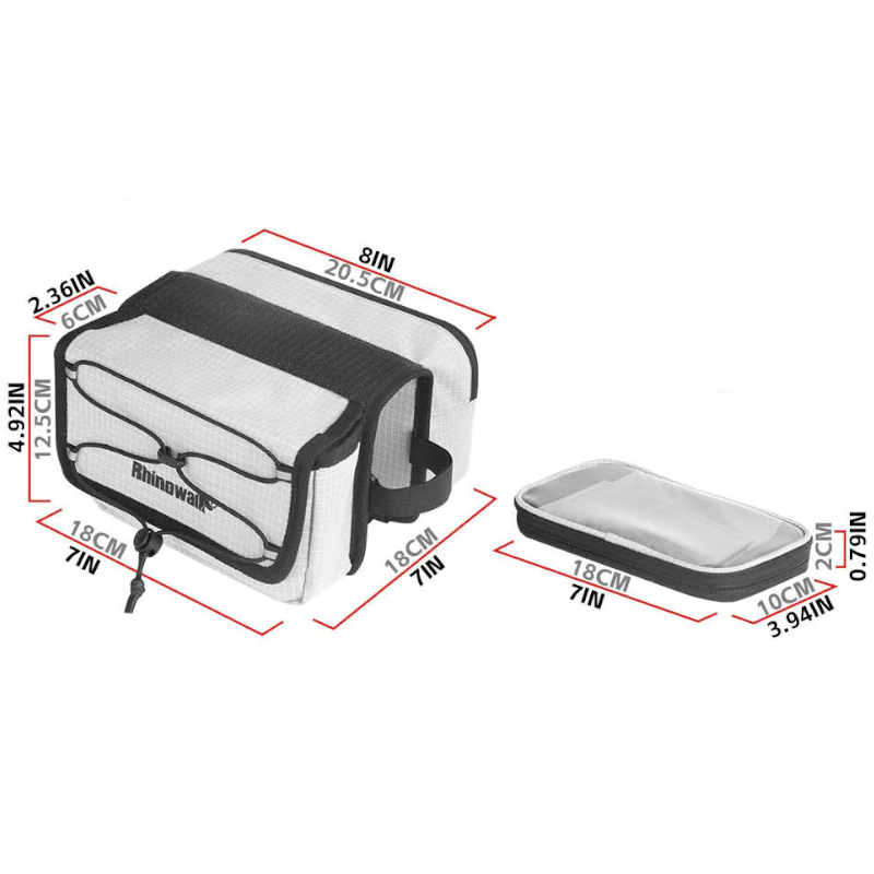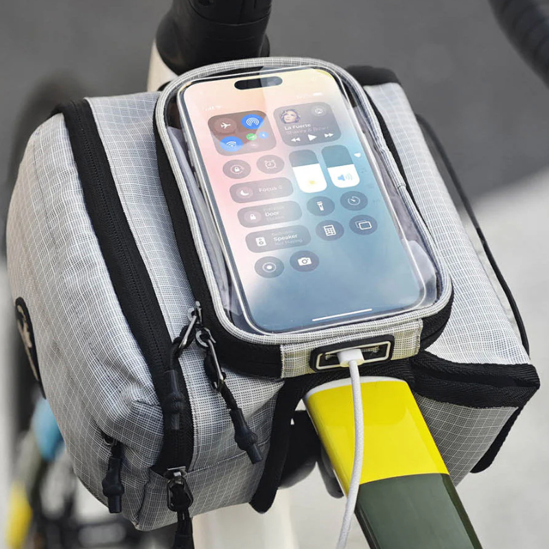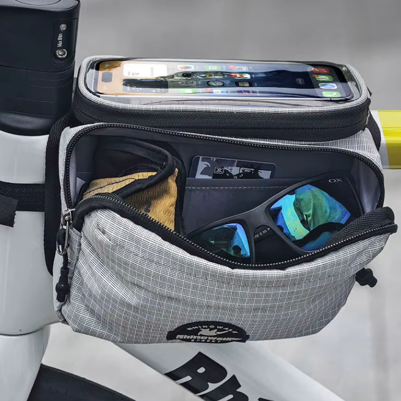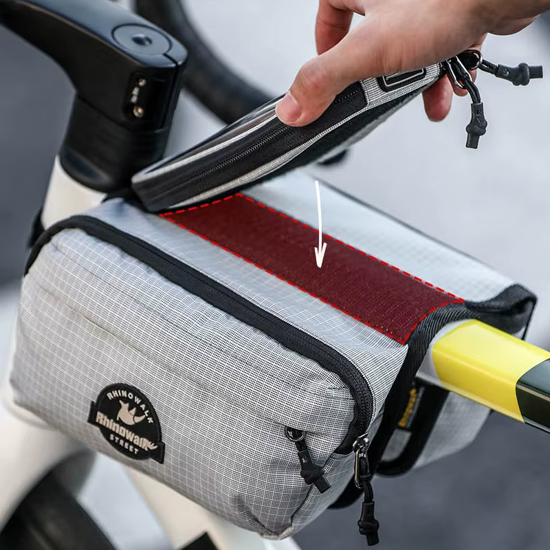 Torba rowerowa na ramę podwójna BCT0205WH marki RHINOWALK to torba z odpinanym etui na telefon montowana na ramie roweru, która sprawia że smartfon jest zawsze pod ręką, bezpieczny i w pełni obsługiwalny bez zatrzymywania się. Przezroczysta nakładka z materiału TPU umożliwia swobodne korzystanie z ekranu dotykowego przez cały czas jazdy — bez wyjmowania telefonu z etui.