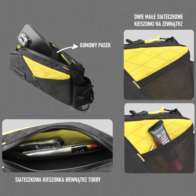 Wnętrze torby skrywa specjalny pasek mocujący na smartfona, który stabilizuje urządzenie (do 6,5 cala) i zapobiega jego przesuwaniu się lub obijaniu w czasie jazdy. Dodatkowe siatkowe kieszonki po bokach umożliwiają uporządkowane przechowywanie drobnych przedmiotów, jak klucze, karty czy gotówka.