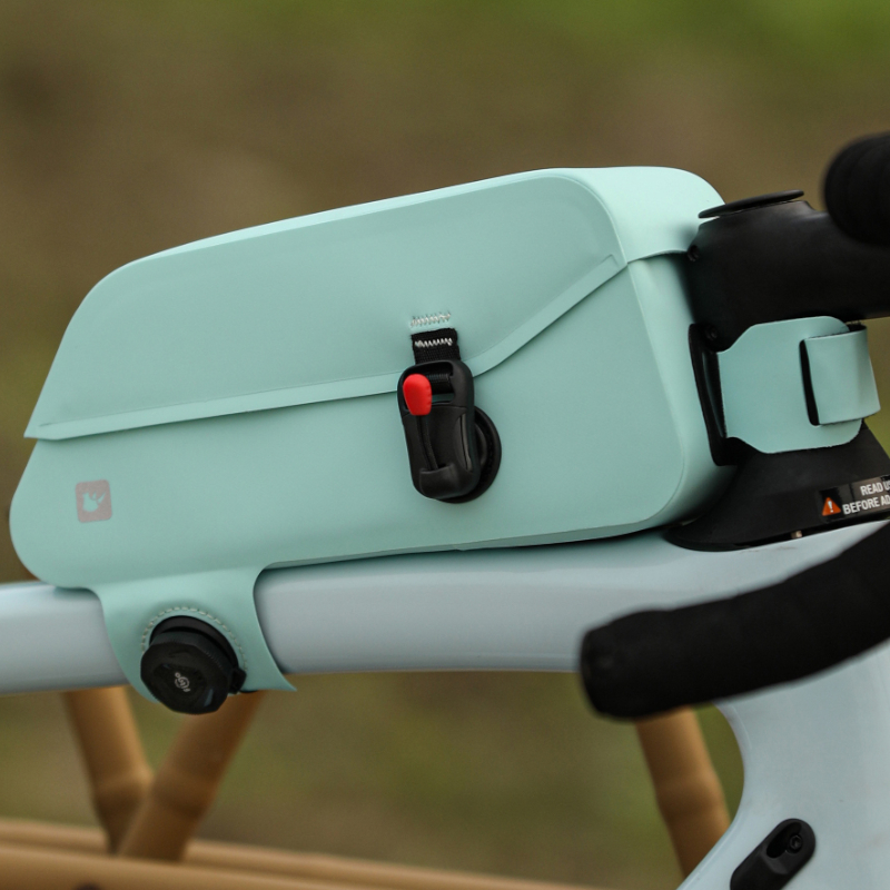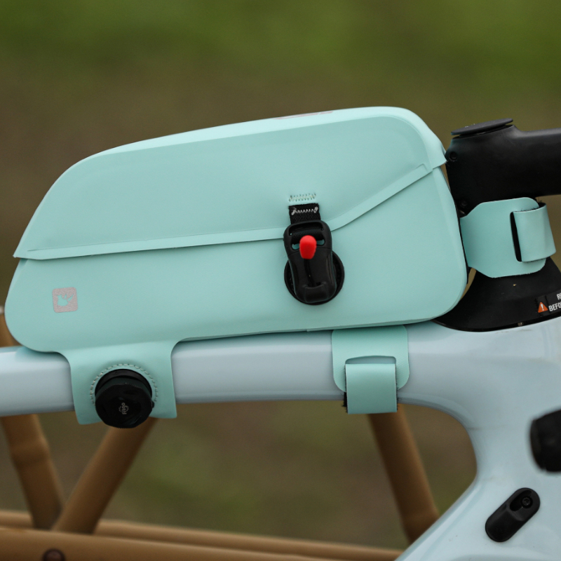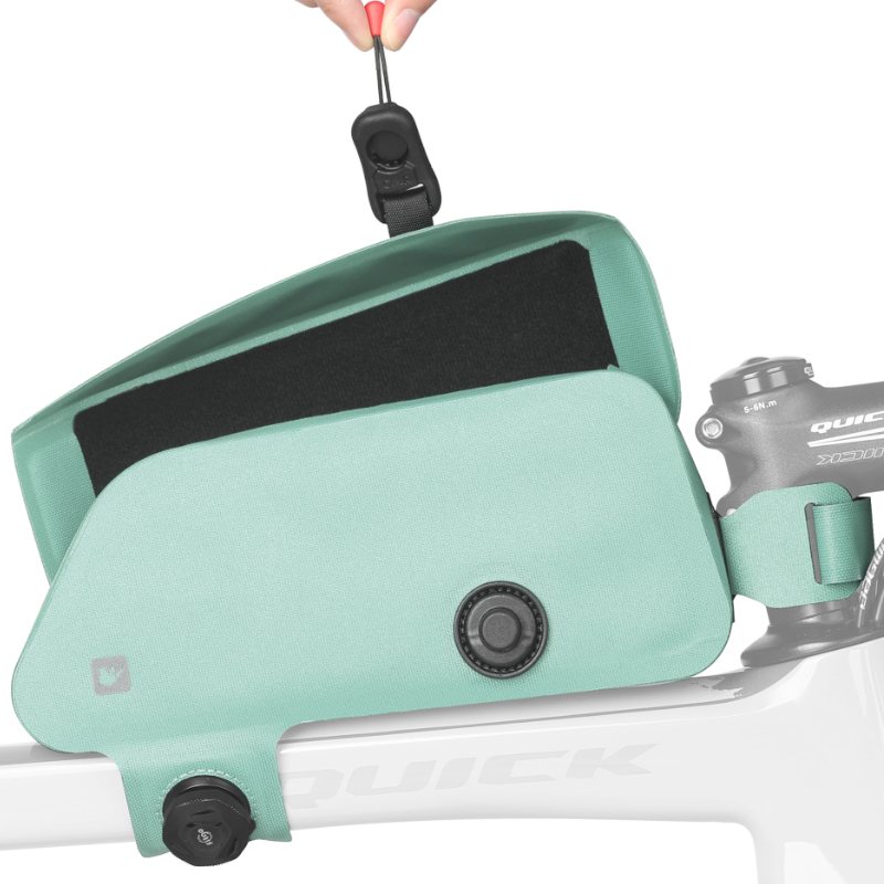 Komora torby zamykana i otwierana jest za pomocą magnetycznego zapięcia, które dzięki wbudowanemu sznurkowi umożliwia obsługę jedną ręką – bez problemu otworzysz ją podczas jazdy. Sakwa mocowana jest do roweru za pomocą wytrzymałego paska rzepowego oraz sznurka z pokrętłem (system stosowany na przykład w butach rowerowych).