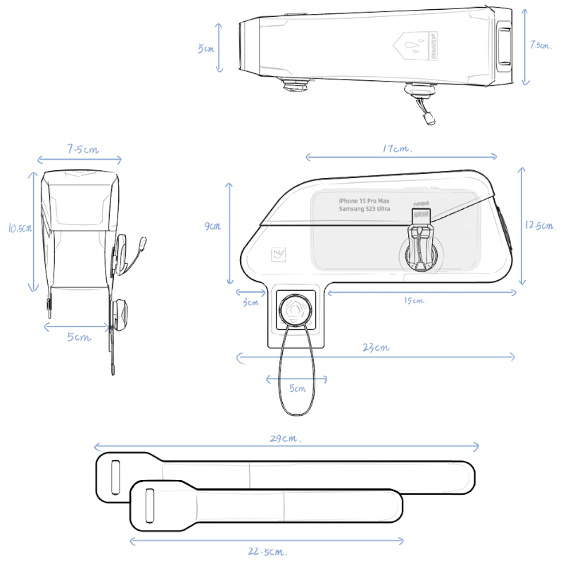 - Mocowana do ramy za pomocą paska na rzep oraz linki z pokrętłem