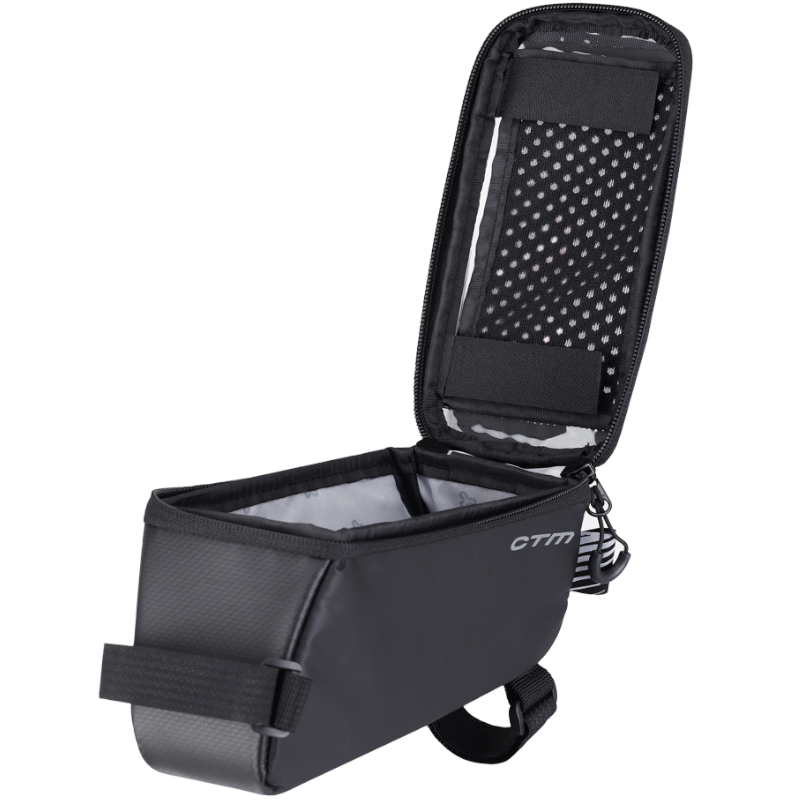 Na górze torby znajduje się przezroczysta, dotykowa kieszeń, która pomieści smartfon o wymiarach do 18 × 9,5 cm. Dzięki niej możesz w czasie jazdy wygodnie korzystać z nawigacji lub aplikacji treningowych, bez potrzeby wyjmowania telefonu.