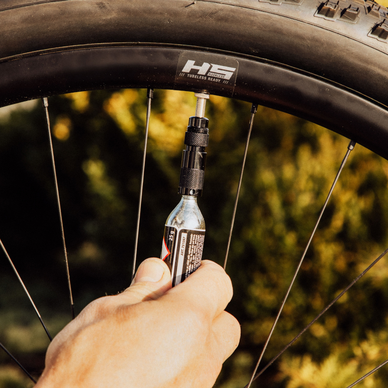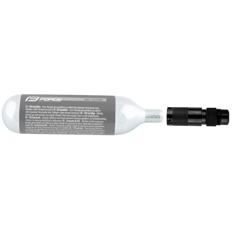 - inflator z przyciskiem odpowietrzającym do gwintowanego wkładu CO2 (nadaje się do zaworów AV – schrader i FV – presta)